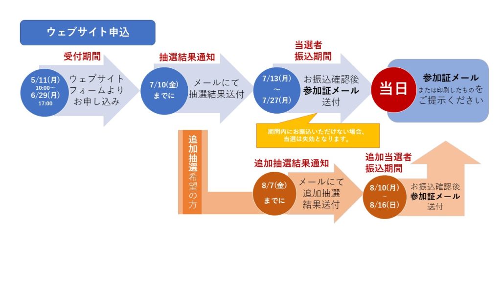 - ・当選者にキャンセルが発生した場合、追加抽選を実施予定です。追加抽選をご希望の方は、受付フォーム内の該当箇所にチェック、往復ハガキ申し込みの場合はハガキにご記載ください。