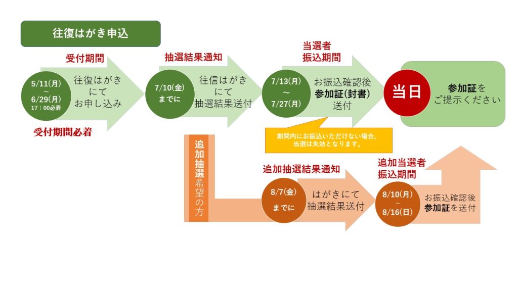 申込期間Web申し込み:5月11日(月)10:00~6月29日(月)17:00/ハガキ申し込み:5月11日(月)~6月29日(月)17:00必着
