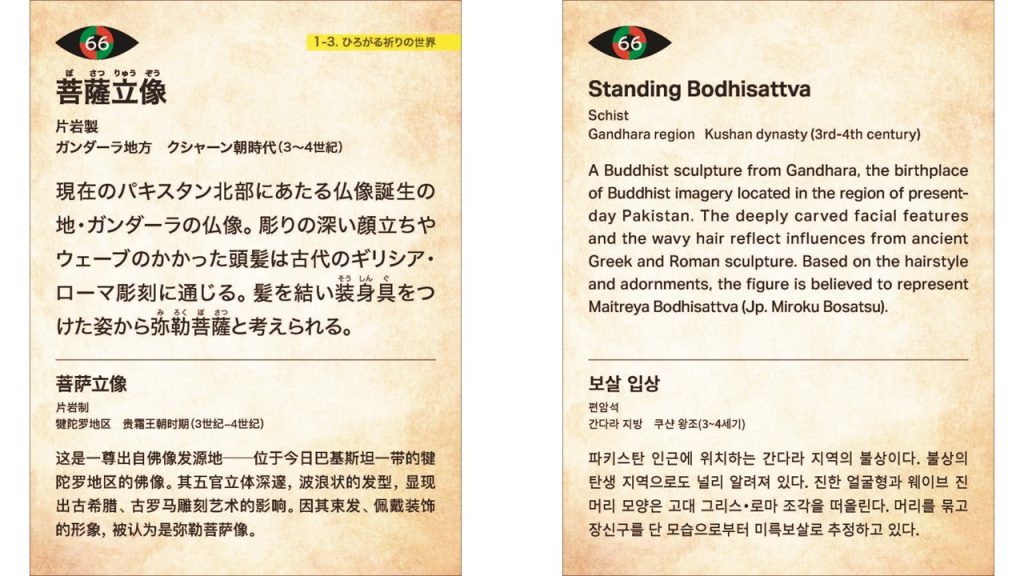 博物館にとって、作品の展示意図を示すことは使命の一つである。奈良博では近年、幅広い層へ向けた教育普及活動のほか、外国人観覧客のための題箋(キャプション)の多言語化にも力を入れ、拡充を図っているところだ。今回は会場に掲示する展示企画の概要やトピックを伝えるパネル、作品のそばに添える題箋を作る現場から話をしたい。